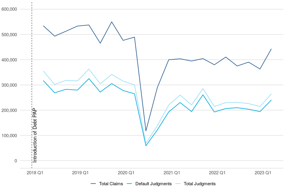 Historically, money claims reached a peak in April to June 2017, after which the implementation of the Pre-Action Protocol (PAP) for Debt Claims in October 2017 led to a sharp drop in claims. An increasing trend resumed the following quarter, suggesting that the impact of the PAP on claim volumes was temporary. The main aim of the protocol is to encourage early engagement between parties to resolve disputes without needing to start court proceedings. In the most recent quarter (January to March 2023), there were 371,000 claims, up 9% on the same quarter in 2022 (340,000 claims).