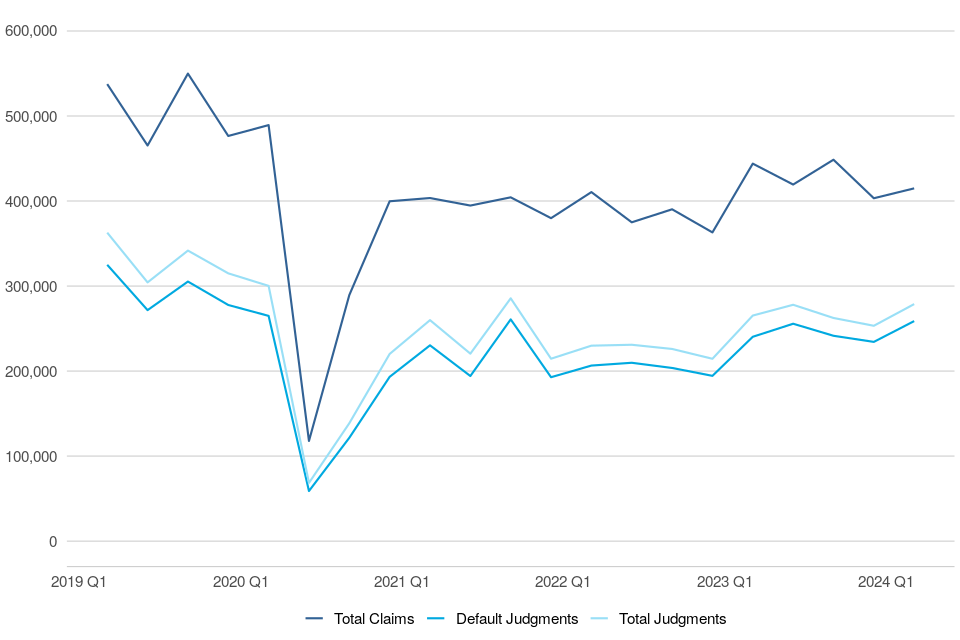 There were 279,000 judgments made in January to March 2024, compared to 265,000 in the same quarter of 2023. Of these judgments, 259,000 (93%) were default judgments.