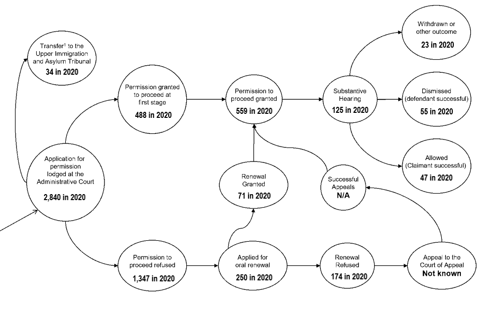Figure 4: Flow chart showing a simplified Judicial Review process, with 2020 case progression figures[footnote 1]