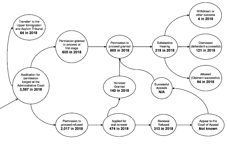 Figure 4: A flow diagram showing the movement of judicial review cases through the court system (through initial application, first stage and renewal stage, to final hearing)