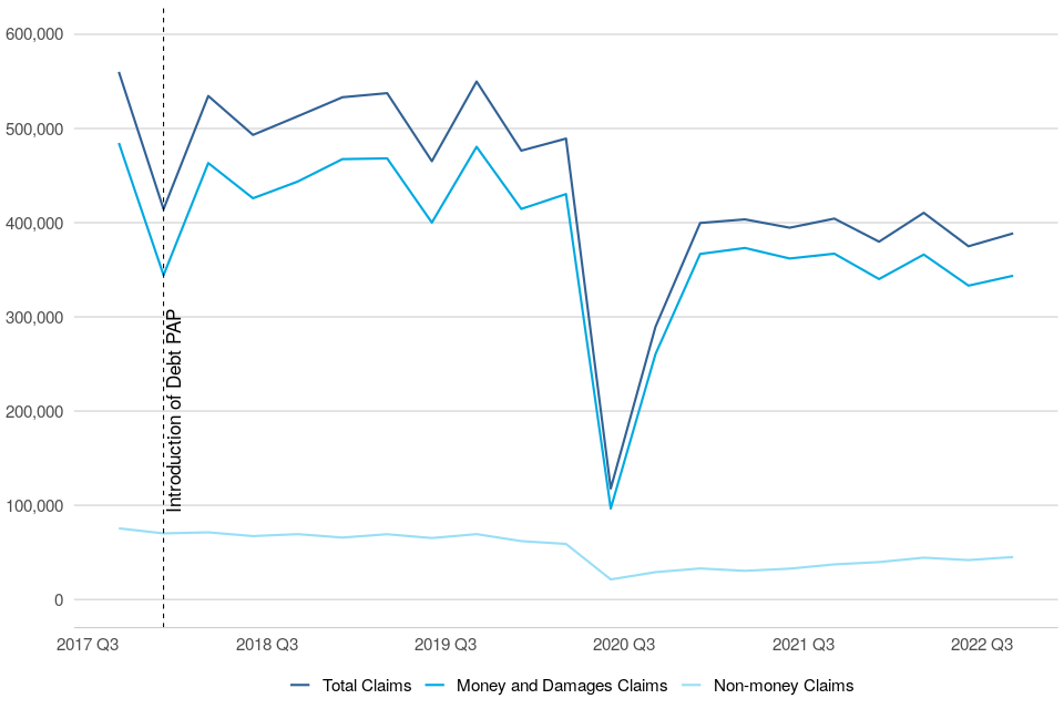 Historically, money claims reached a peak in April to June 2017, after which the implementation of the Pre-Action Protocol (PAP) for Debt Claims in October 2017 led to a sharp drop in claims. An increasing trend resumed the following quarter, suggesting that the impact of the PAP on claim volumes was temporary. The main aim of the protocol is to encourage early engagement between parties to resolve disputes without needing to start court proceedings. In the most recent quarter (July to September 2022), there were 317,000 claims, down 5% on the same quarter in 2021 (332,000 claims).