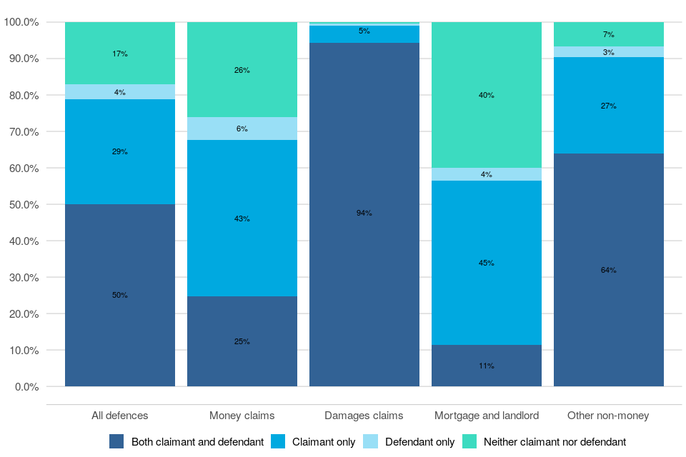Of those claims defended in July to September 2022, 50% had legal representation for both claimant and defendant, 29% had representation for claimant only, and 4% for defendant only. Almost all (94%) damages claim defences had legal representation for both the defendant and claimant, compared with 25% of money claim defences.