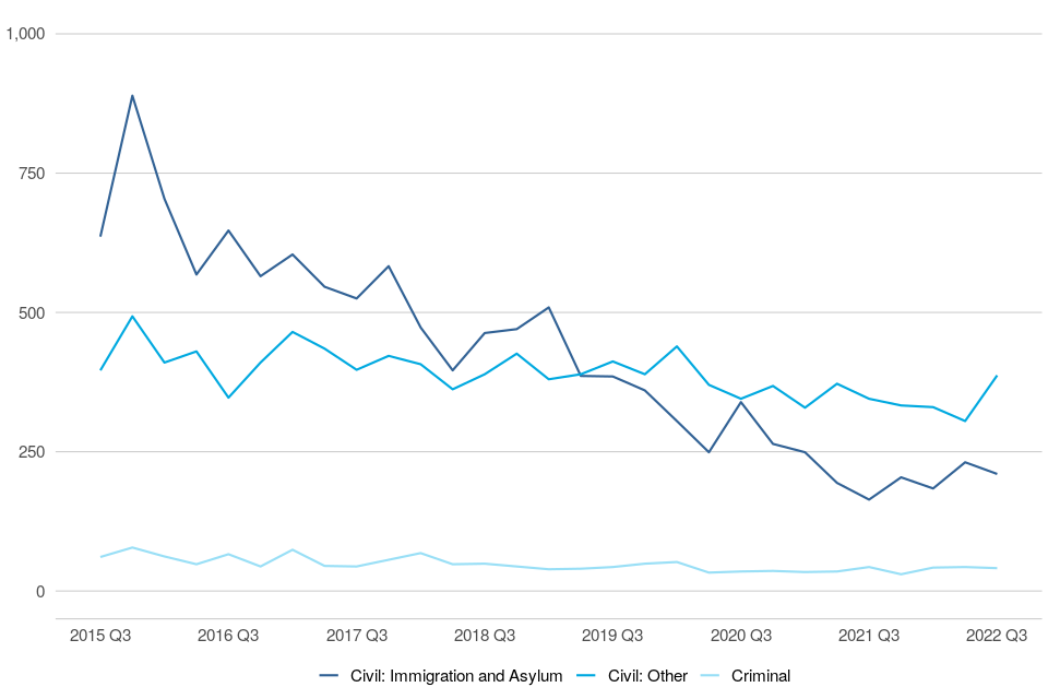Of the 640 applications received in Q3 2022, 210 were civil immigration and asylum applications, 390 were civil (other), and 41 were criminal, up 28%, up 12% and down 5% respectively on Q3 2021. 6 of the civil immigration and asylum cases have since been transferred to the UTIAC.