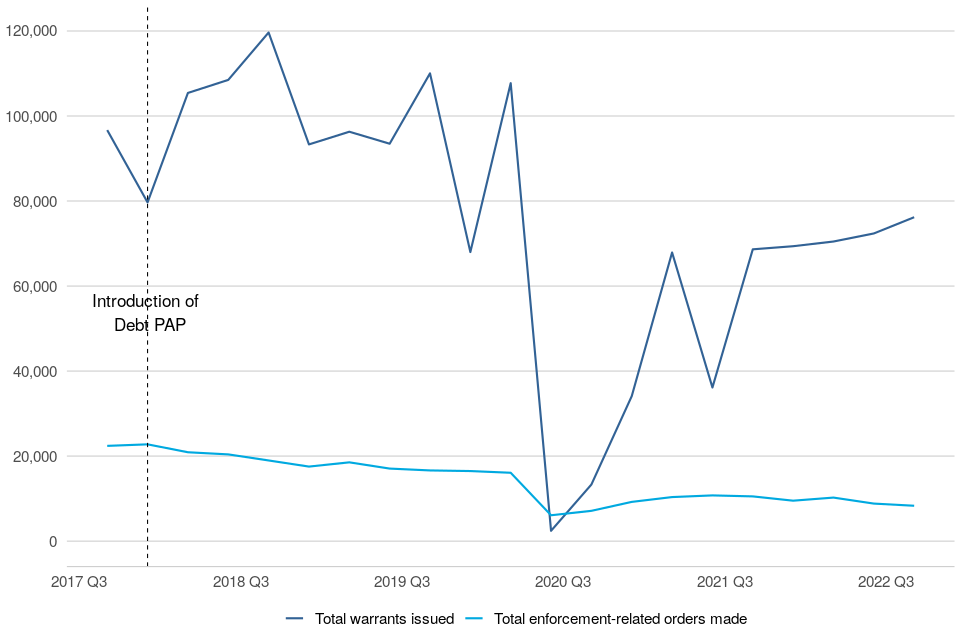 Figure 6: Warrants and enforcements issued – Q3 (July to September) 2017 to Q3 (July to September) 2022 (Source: tables 1.7 and 1.8)