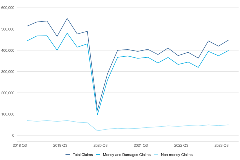 Money claims were up 16% (to 369,000 claims) in July to September 2023 compared to the same quarter in 2022.