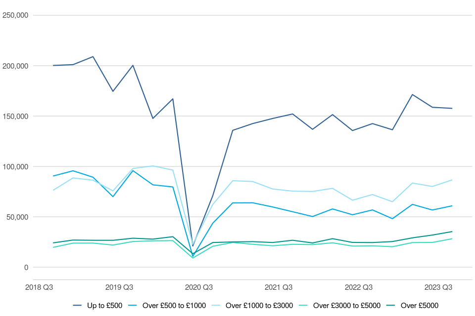The number of money claims in every category rose in Q3 2023 compared to the same quarter in 2022, with money claims valued under £500 and between £1,000 and £3,000 increasing the most. These were up 11% and 20%, to 158,000 and 87,000 claims respectively in the period July to September 2023 compared to the same quarter in 2022. Claims valued under £500 accounted for 43% of total money claims in the most recent quarter. This is close to historical levels with this category making up 45% of total money claims in July to September 2019. This trend may be typical of the current economic cycle where people are more likely to claim – even for small amounts – in a cost-of-living crisis when disposable income falls due to high inflation, low or no economic growth, and continued rises in interest rates.