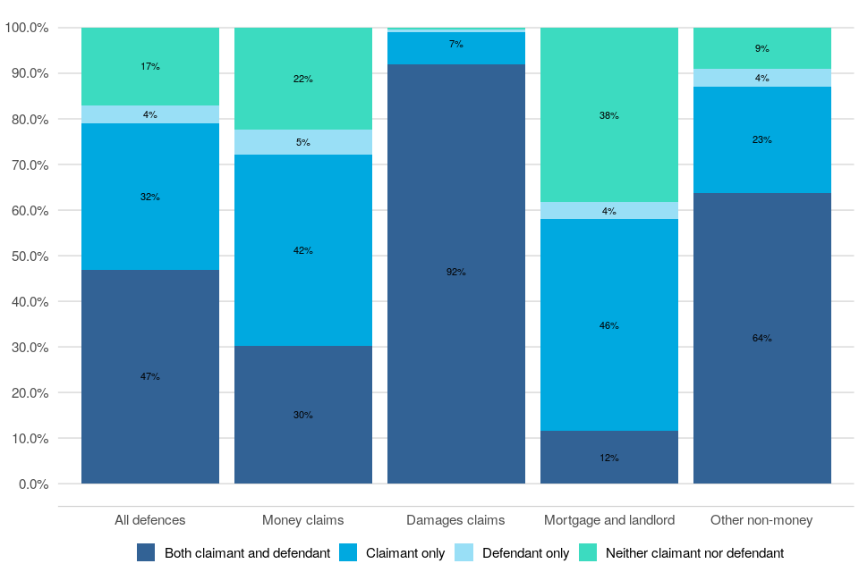 Of those claims defended in July to September 2023, 47% had legal representation for both claimant and defendant, 32% had representation for claimant only, and 4% for defendant only. Almost all (92%) damages claim defences had legal representation for both the defendant and claimant, compared with 30% of money claim defences.