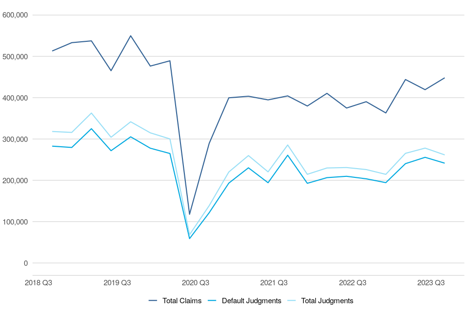 | Judgments were up 16% and default judgments were up 19% | Judgments were up 16% (to 262,000) in July to September 2023, compared to the same period in 2022; with 92% of these being default judgments. Compared to the same period in 2019, judgments were down 23%, 89% of which were default judgments. |
