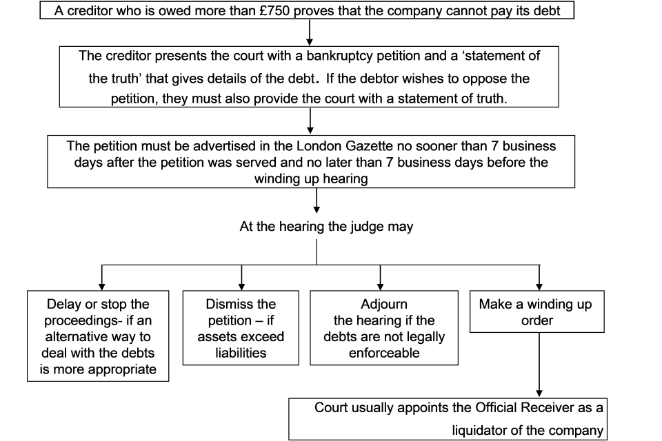 The process for creditor’s petitions cases is very similar except that the petition need not be advertised in the London Gazette.