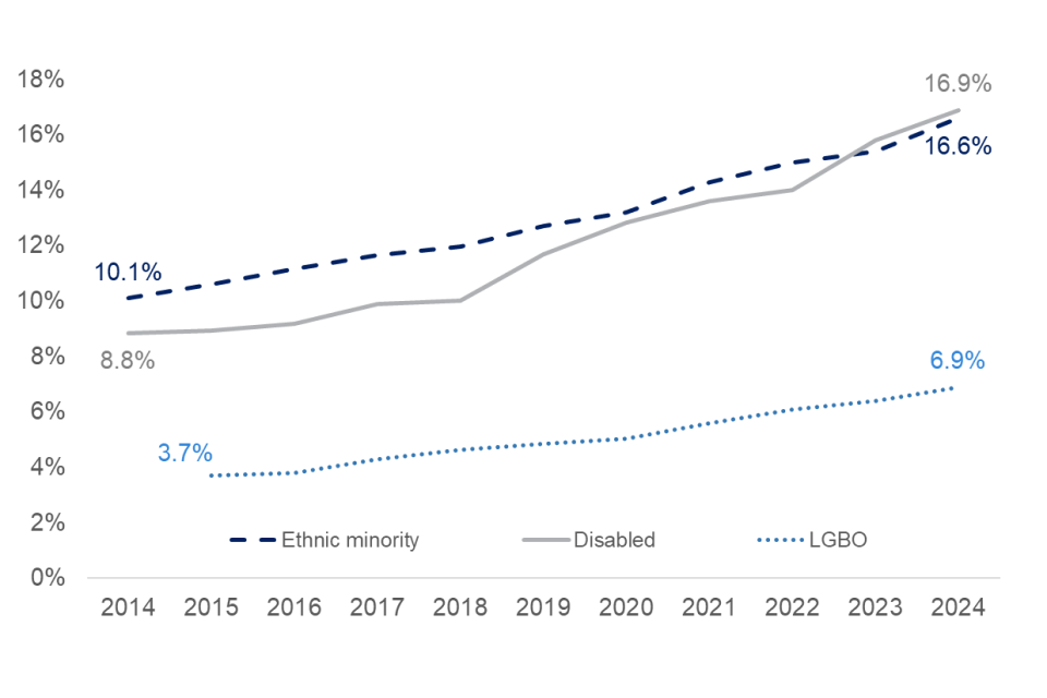 Figure 1.1: Representation of ethnic minority, disabled and LGBO civil servants, 2014 to 2024 (see table E1)