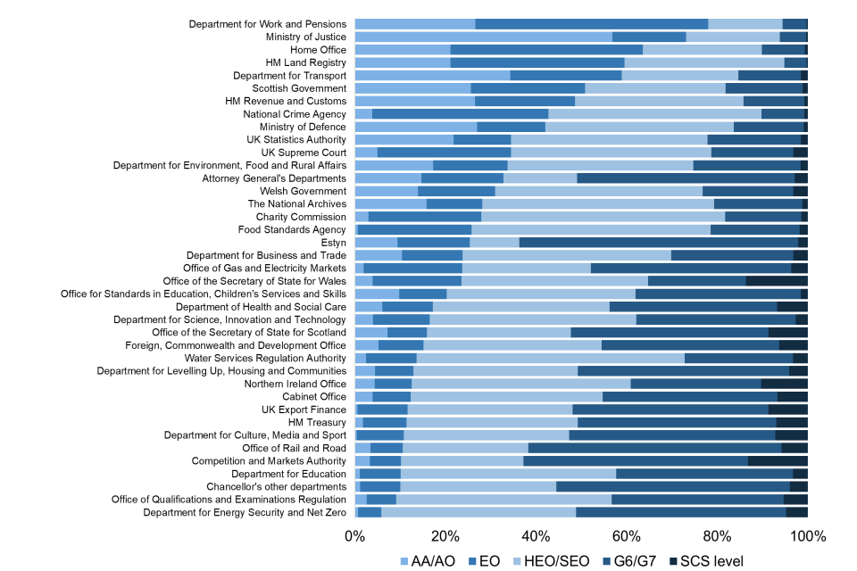 Departments with large numbers of front-line staff delivering public services tend to have a higher proportion of junior grades. For example, the Department for Work and Pensions (DWP) has the highest percentage of staff at EO grade and below (78.0%).