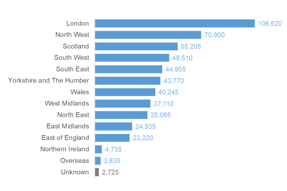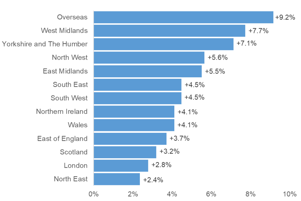 Excluding Overseas, the regions with the largest percentage increases in headcount are the West Midlands (+7.7%), Yorkshire and The Humber (+7.1%), North West (+5.6%) and East Midlands (+5.5%). The regions that have seen the largest increase in headcount are the North West (+3,790), Yorkshire and The Humber (+2,915), London (+2,885) and West Midlands (+2,665).