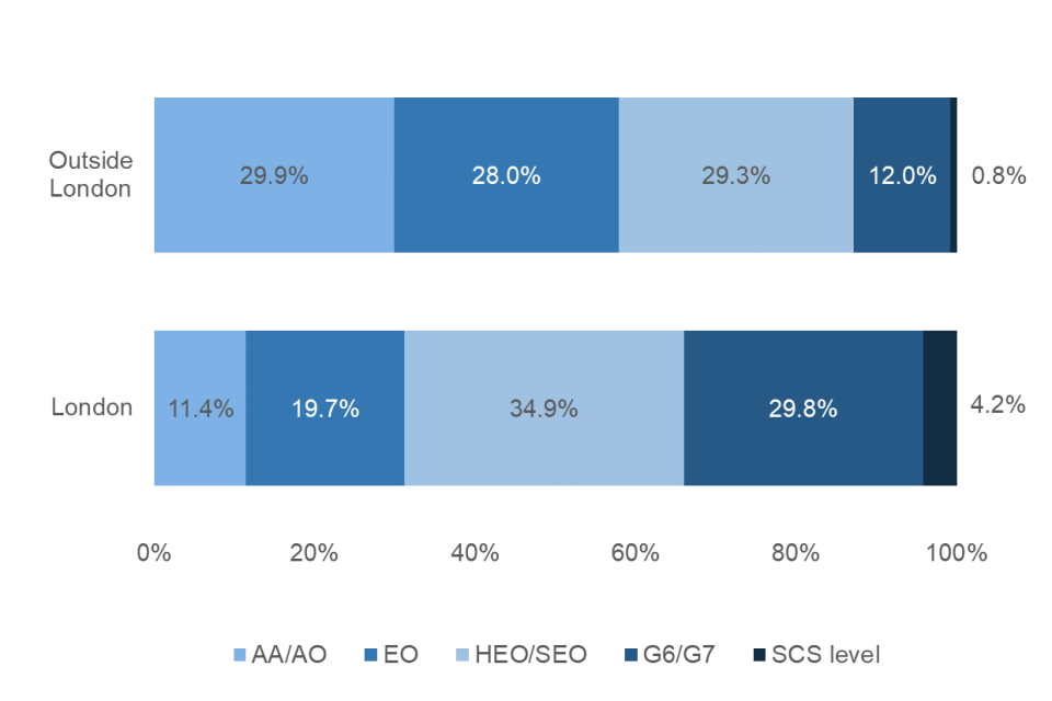 Outside of London, 29.9% of civil servants are in AA/AO grades, compared to 11.4% within London. The percentage of those in G6/G7 and SCS level grades outside of London is 12.8%, compared to 34.0% within London.