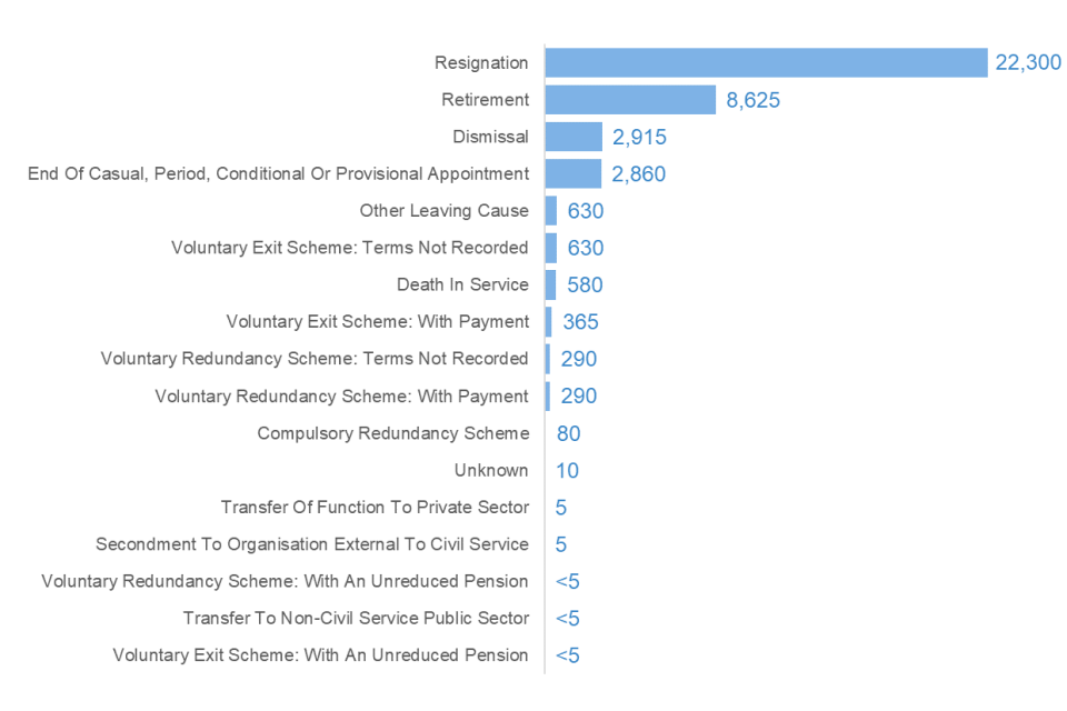 The most common reason for leaving the Civil Service was resignation, accounting for over half (22,300) of leavers. The next most common reason was retirement (8,625).