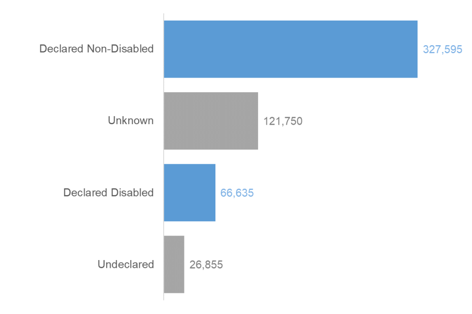 Percentages exclude those with an unknown disability status and those that have elected to not declare themselves as either disabled or non-disabled. The working age population figure includes only those who are economically active. See Notes section for more information.