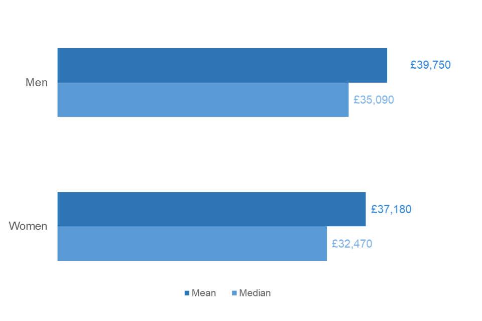 Women have a median salary of £32,470, compared to £35,090 for men. Women have a mean salary of £37,180 compared to £39,750 for men. Salary differences between the sexes are partly explained by their relative representations across the grades.