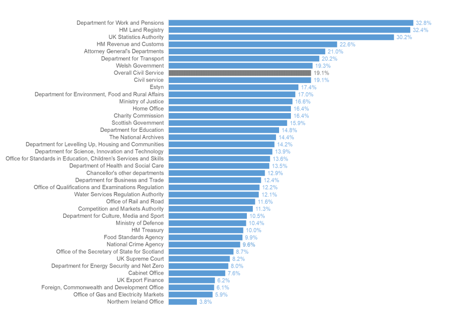 Turnover rate includes all moves out of the Civil Service over each year to 31 March. Full details for turnover calculations are available here.