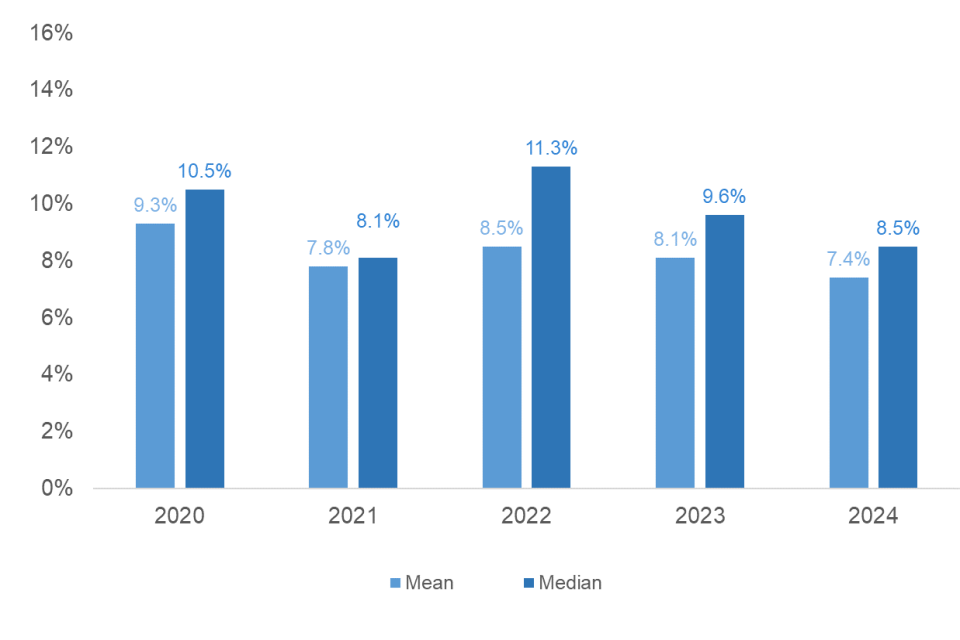 The median and mean gender pay gap for the Civil Service is 8.5% and 7.4%, down from 9.6% and 8.1% in 2023 respectively.