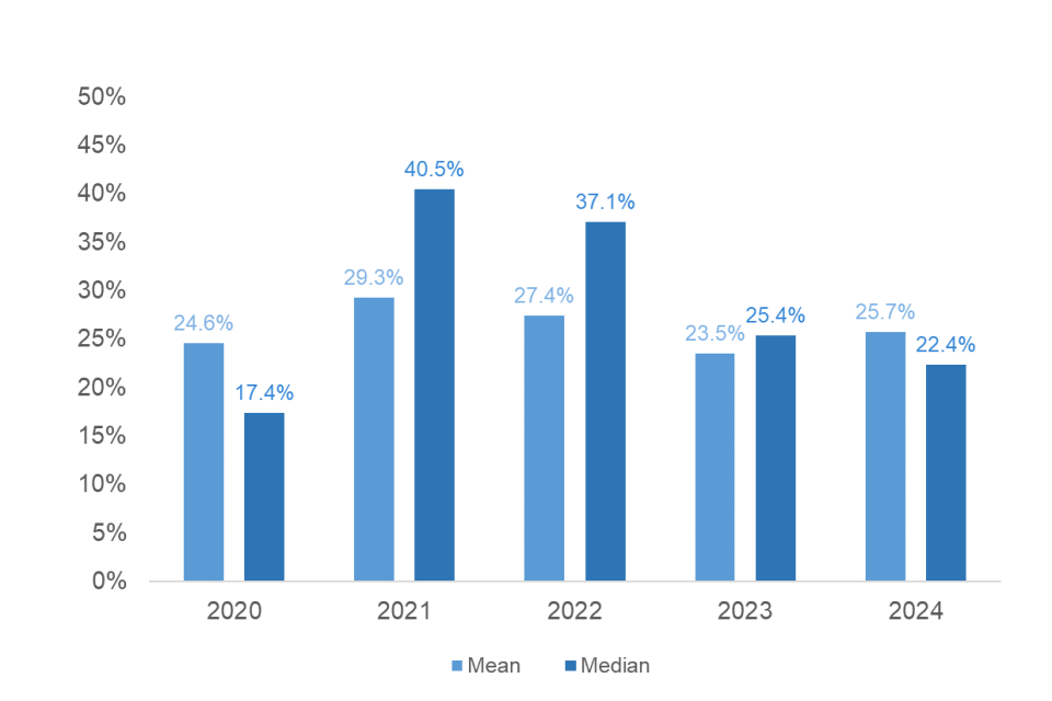 The median bonus gender pay gap for the Civil Service showed a decrease from 25.4% in 2023 to 22.4% in 2024, whilst the mean bonus gender pay gap increased from 23.5% to 25.7% across the same period.
