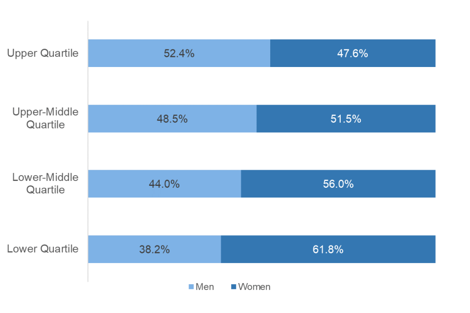 Women are under-represented in the highest pay quartile (47.6% compared to 52.4% of men) and overrepresented in the lowest pay quartile (61.8% compared to 38.2% of men).