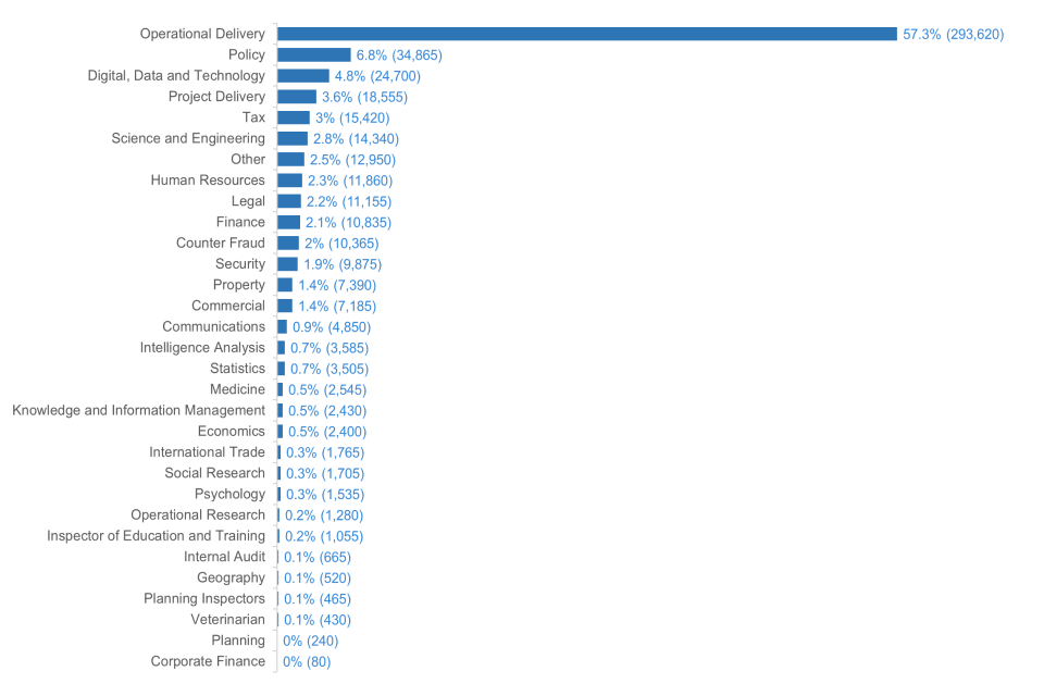 The majority of civil servants (57.3%) work in the Operational Delivery profession. Operational Delivery staff provide frontline government services directly to citizens or businesses, including paying benefits and pensions, providing employment services, staffing prisons, and issuing driving licences.