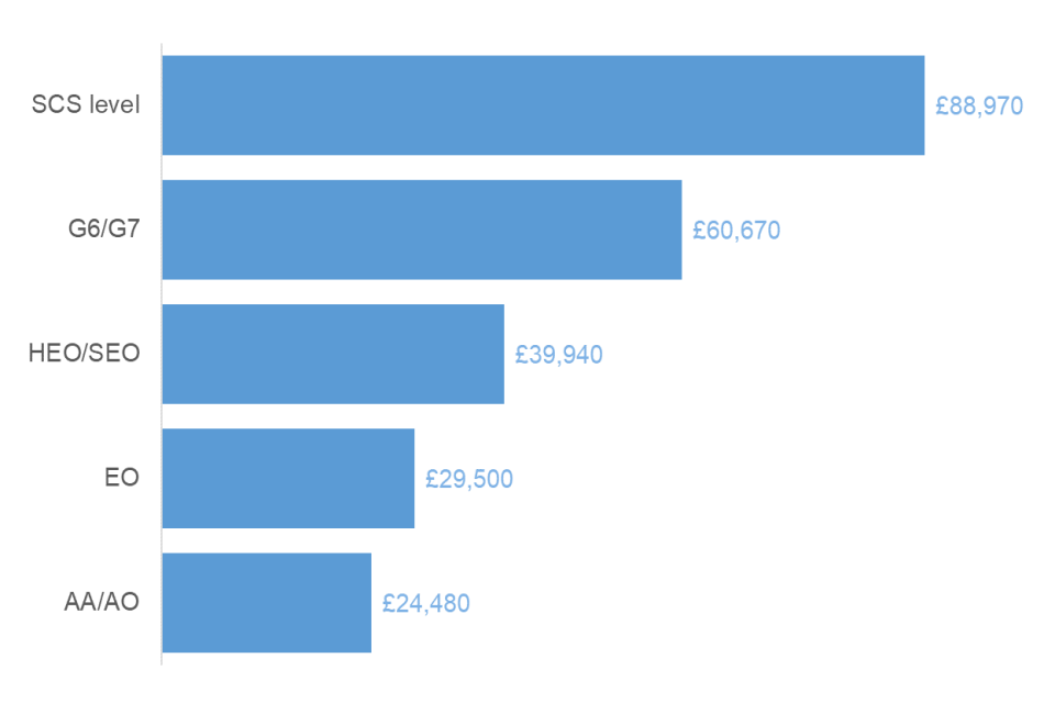 The median salary varies by grade, from £24,480 in the administrative grades to £88,970 at SCS level.