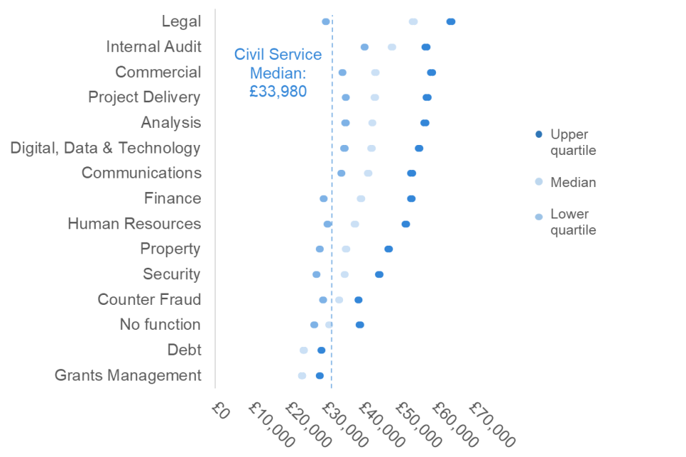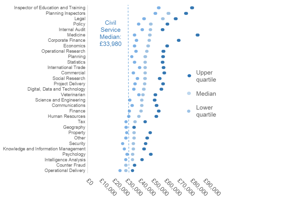 Those with the lowest median salary are Operational Delivery (£29,500) and Counter Fraud (£29,630).