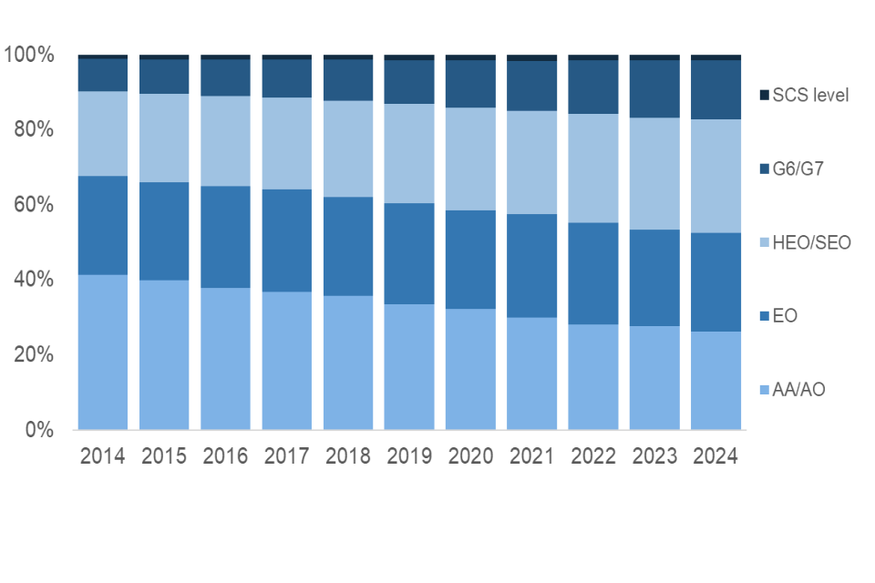 The percentage of civil servants working at grades EO and above is now 73.8%, up from 72.4% in 2023 and 58.7% in 2014.