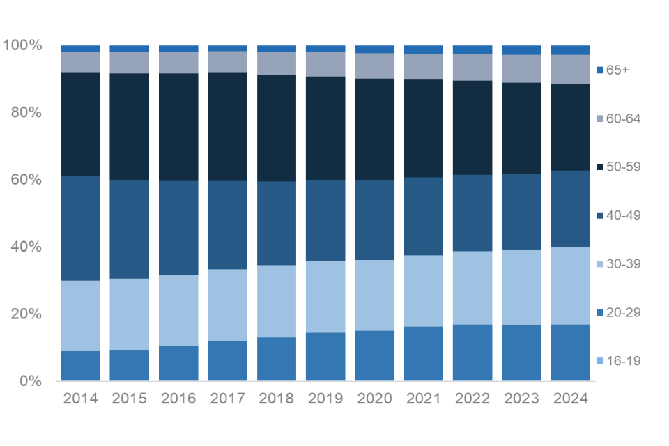 Figure 6.1: Civil Service by age band, 2014 to 2024 (see tables 4 and E5)