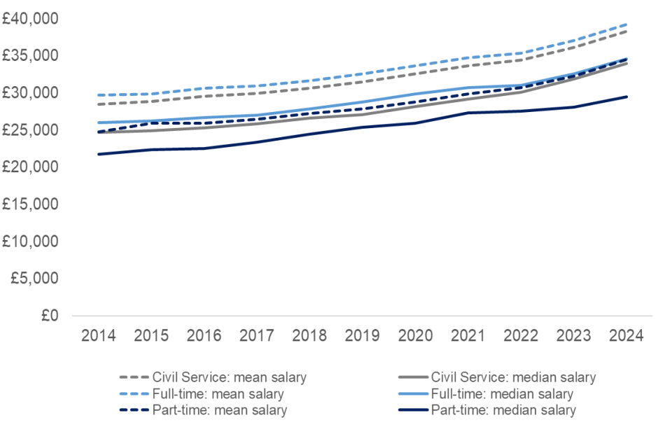 Figure 11.1: Median and mean salary of full-time, part-time, and all civil servants, 2014 to 2024 (see table E9)