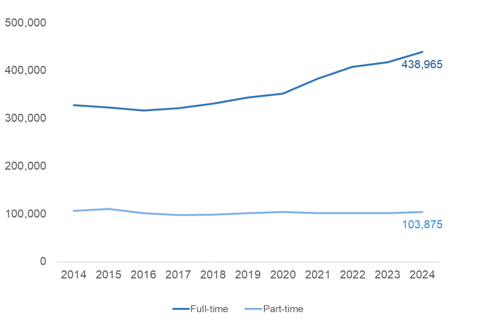 The number of civil servants working full-time is 438,965; an increase from 417,680 (+5.1%) in 2023.