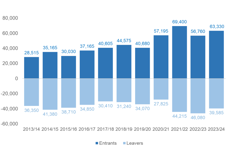 Figure 16.1: Civil Service entrants and leavers, 2013/14 to 2023/24 (see table E13)