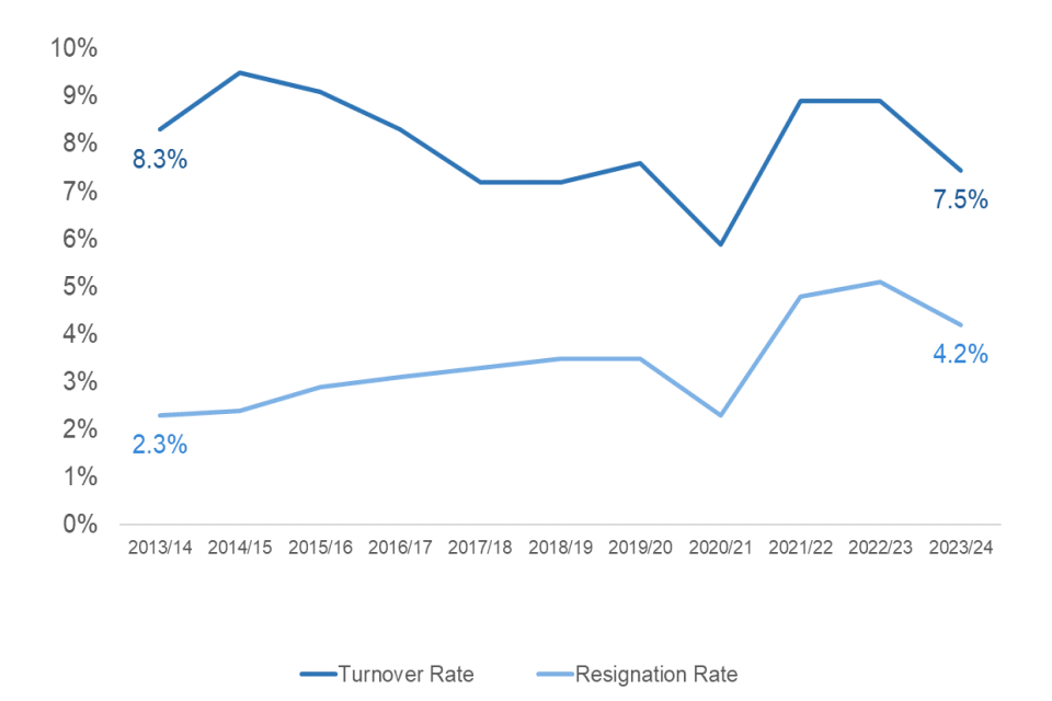 The turnover rate in the Civil Service fell to 7.5% from 8.9% in 2022/23. The resignation rate fell to 4.2% from 5.1% in 2022/23.