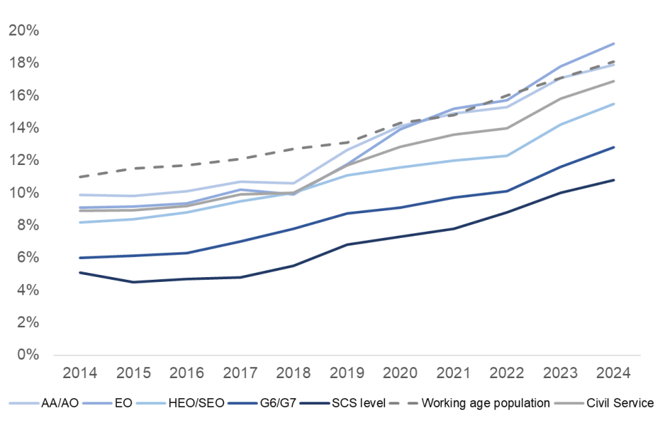 Since 2014 there have been year-on-year increases in the percentage of civil servants who declare themselves as disabled. This figure now stands at 16.9%, a record high, up from 15.8% in 2023, and 8.9% in 2014.