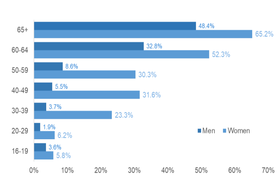 Overall, older age groups have a higher percentage of both men and women working part-time.