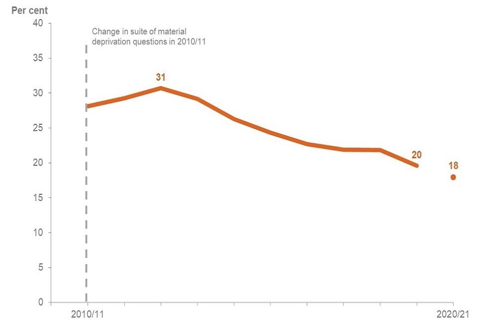 Rates of working age material deprivation fell by 11 percentage points between FYE 2013 and FYE 2020.