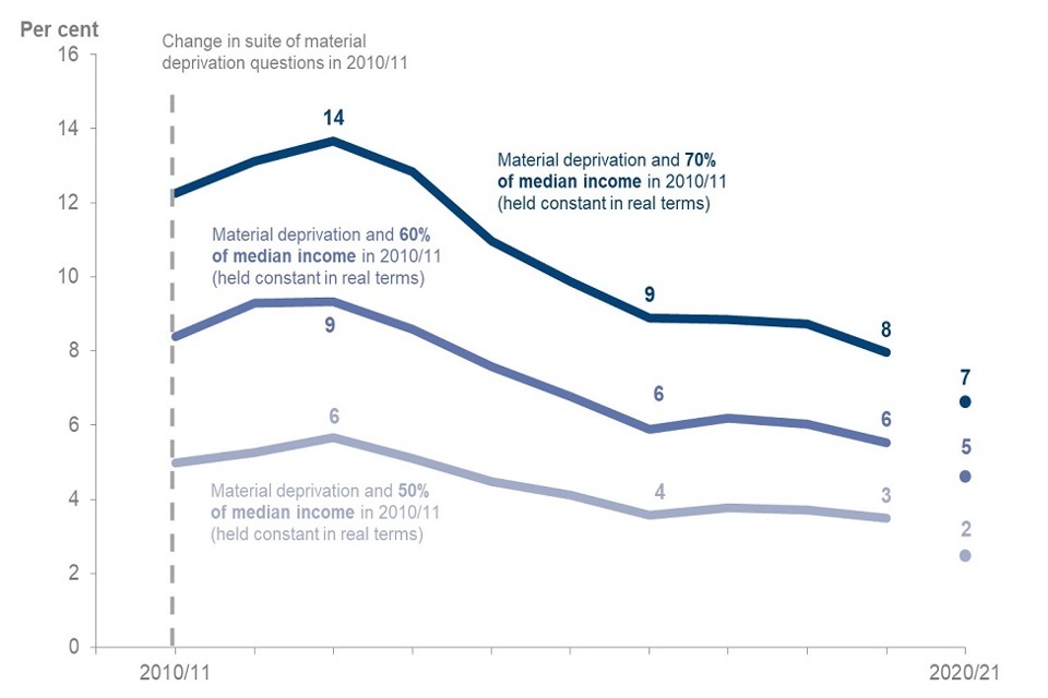 - the rate of combined absolute low income (70% of median income in FYE 2011 held constant in real terms) and material deprivation for working age people in the UK was 7%