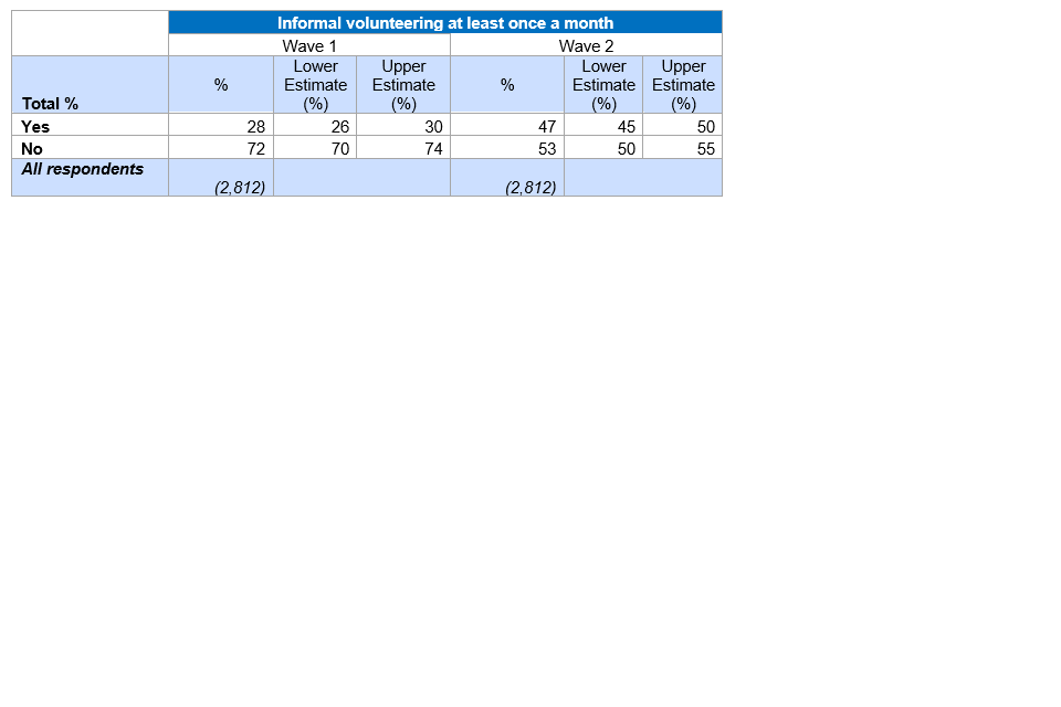 Overall, 47% of wave 2 respondents took part in regular informal volunteering, an increase from 28% at wave 1.
