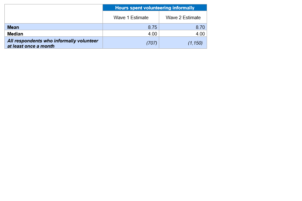 The amount of time spent volunteering among regular informal volunteers was very similar. The median amount of time spent volunteering in the past 4 weeks among regular informal volunteers was 4 hours at both waves (approximately one hour per week).