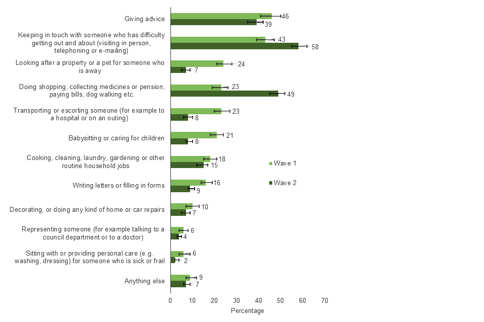Shopping, collecting items, medicine or pensions, pay bills, dog walking etc. (23% at wave 1 vs. 49% at wave 2).