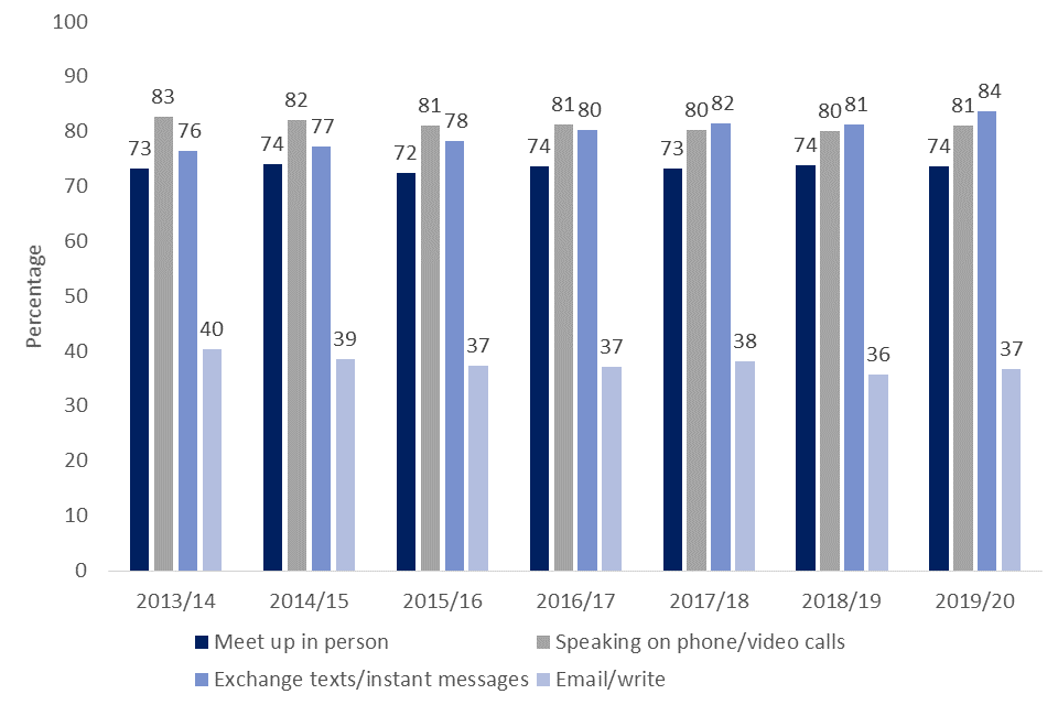 The percentage of respondents who exchange text or instant messages has increased since 2018/19 from 81% to 84%. Since 2013/14, this method has been increasing in popularity. Communicating with friends/family through speaking on the phone/video call and meeting up in person have both remained broadly consistent from 2013/14 to 2019/20. The percentage of respondents emailing/writing has decreased gradually since 2013/14, though no difference is observed between 2018/19 and 2019/20.