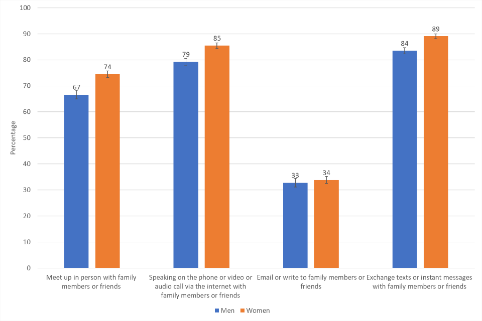 Respondents identifying as female were more likely than those identifying as male to communicate with friends/family by meeting up in person, speaking on the phone/video call or exchanging text or instant messages. The most notable difference was for meeting up in person, with 74% of females doing so at least once a week compared with 67% of males. No difference was seen between males and females for emailing and writing.