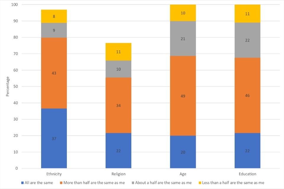 Figure 1.5: Similarity of friends to respondent in terms of ethnic group, religion, education and age group, 2021/22[footnote 4]