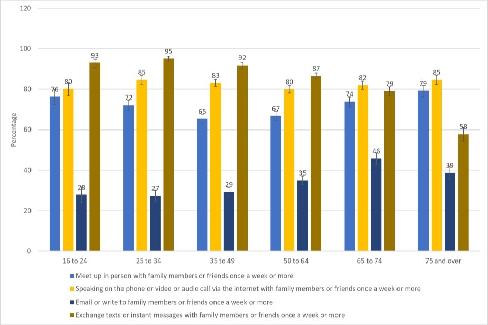 Respondents were asked how often they communicated with family members and friends via a range of methods. When looking at those who used different methods once a week or more: