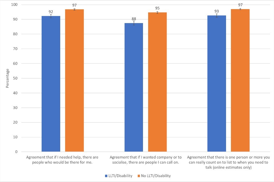 Figure 1.4: Percentage of respondents with support networks available by limiting long-term illness/disability (LLTI/Disability), 2021/22