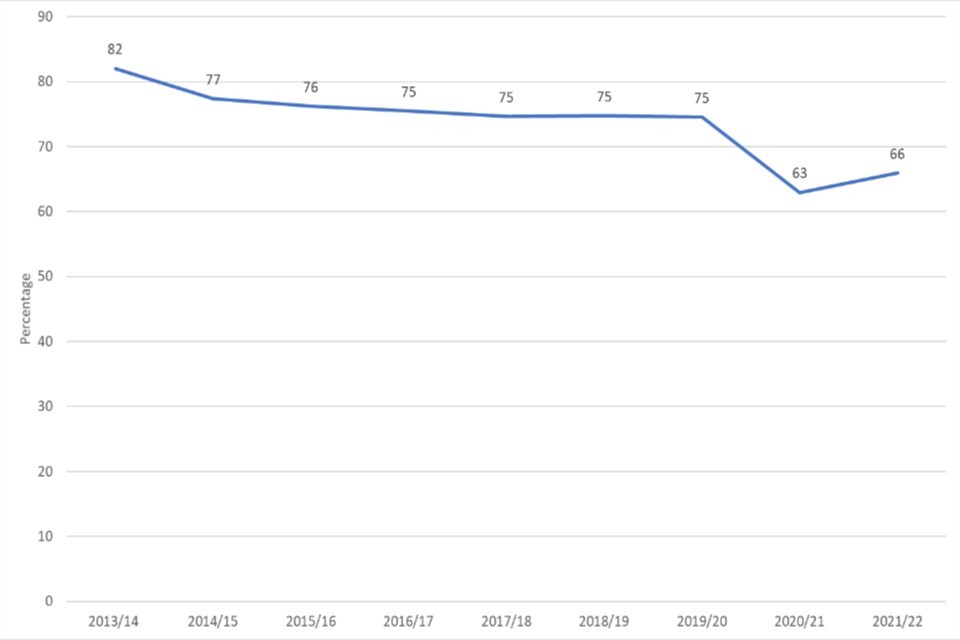 Figure 5.7: Percentage who gave to charitable causes in the 4 weeks prior to completing the survey, 2013/14 - 2021/22