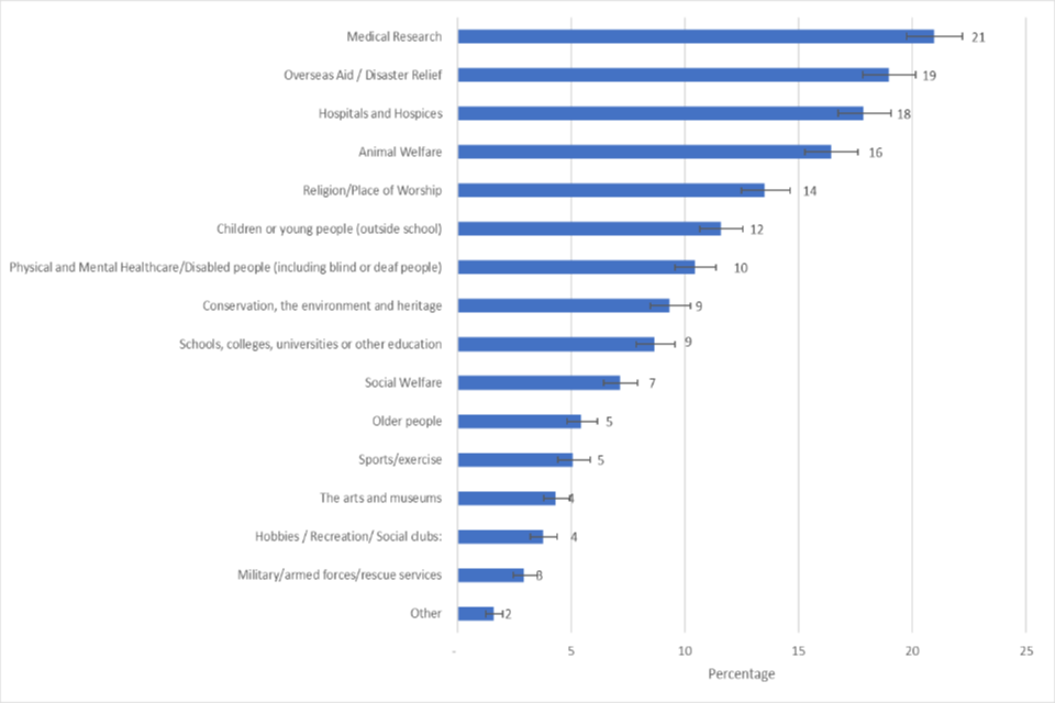 Of those who gave to charitable causes, 21% gave to medical research, in line with 2020/21 rates. 19% gave to overseas aid/disaster relief, an increase of 14% giving to this cause in 2020/21. 18% gave to hospitals and hospices, lower than rates of giving to this area in 2020/21 (24%).