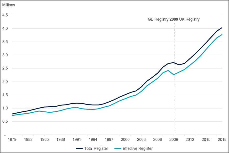 Chart 1: Total and effective register sizes, 1979-2018, UK