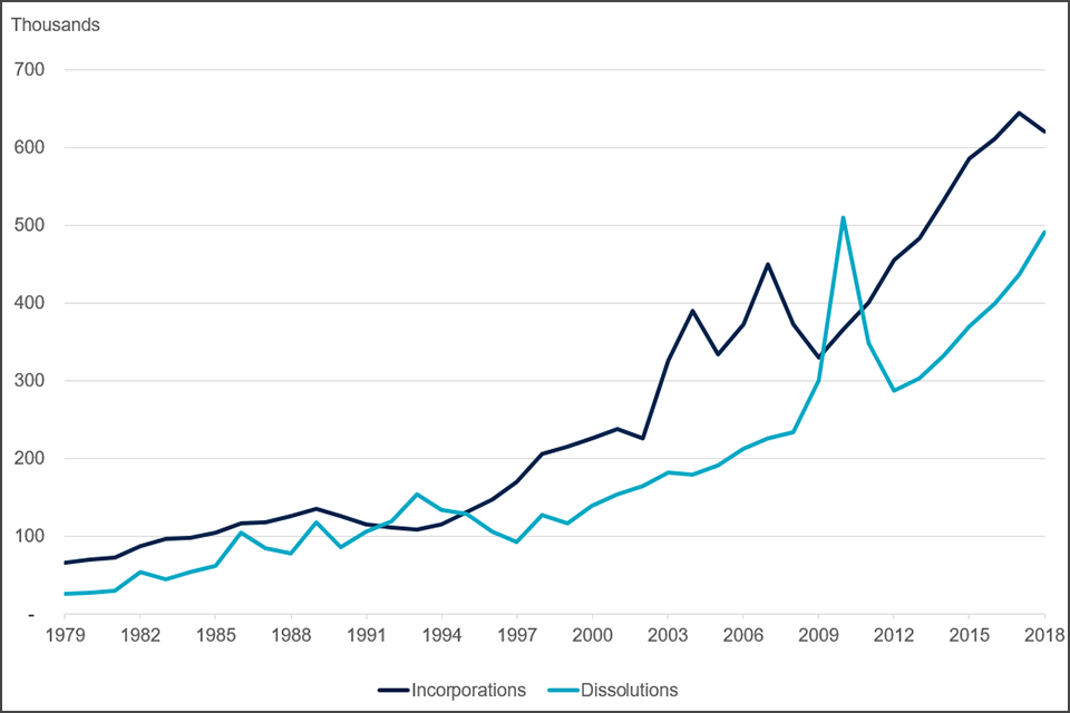 Chart 2: Incorporations and dissolutions, 1979-2018, UK