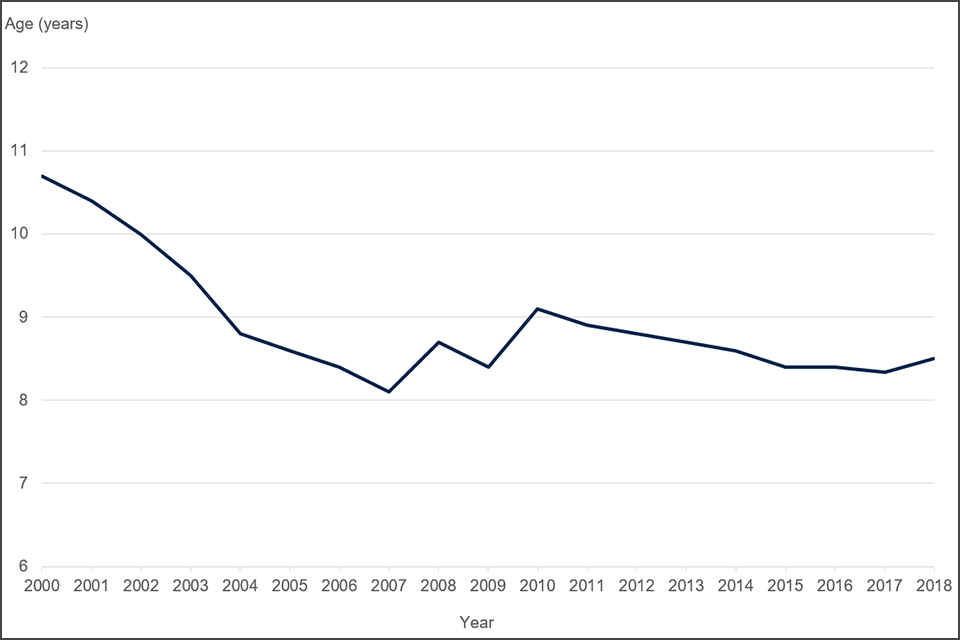 Historically, the average age of companies has always been relatively young, but it has gradually declined from 10.7 years in 2000 to 8.5 years in 2018. Between 2008/09 and 2010/11 the average age of companies fluctuated, corresponding with fluctuations in the numbers of incorporations and dissolutions, and declines in the overall register size.